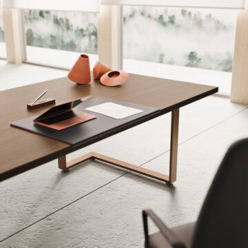 The supporting structure consists of metal legs with an epoxy finish or polished brushed. Legs come in three design options: ring shape, T-shaped and L-shaped. Tops are available in wood veneer or Italian melamine, in backlacquered glass (also in the antifinger version), leather and porcelaine tile, framed by an aluminium profile.