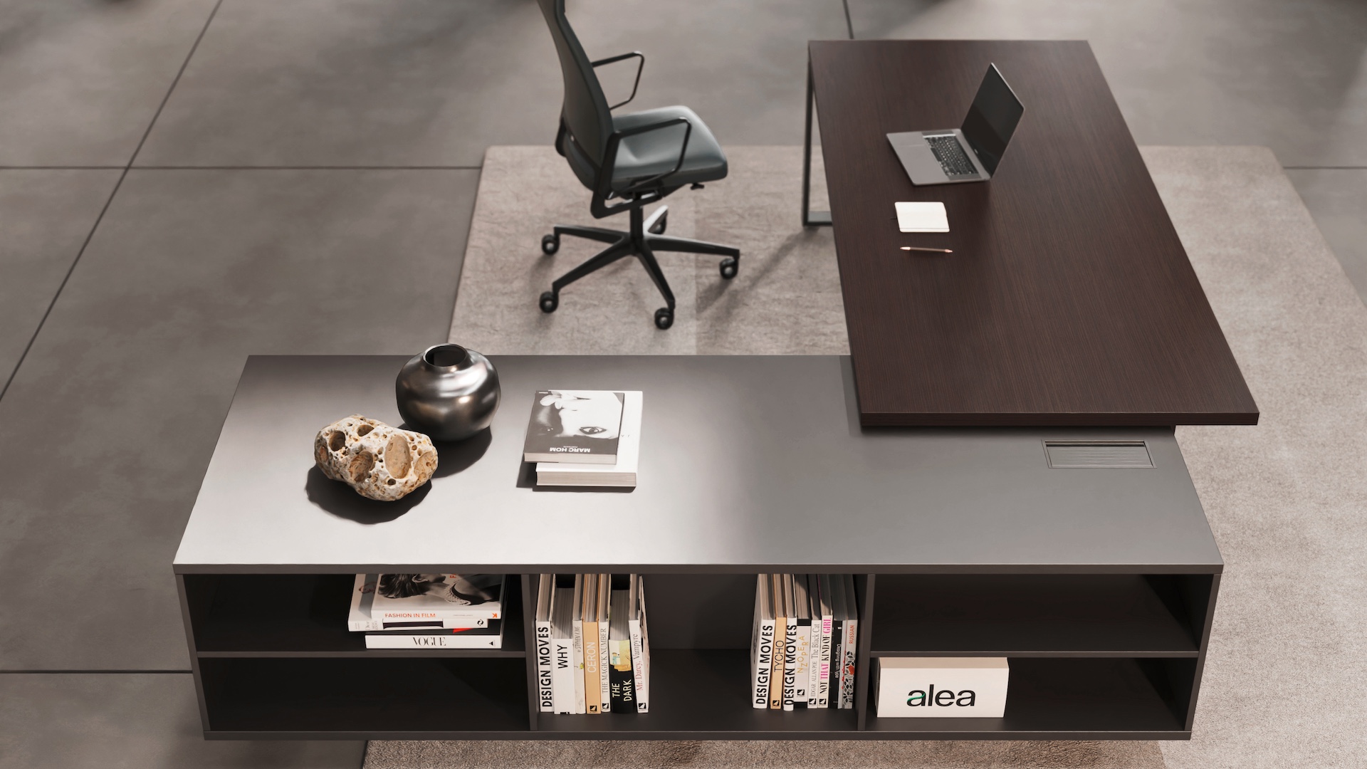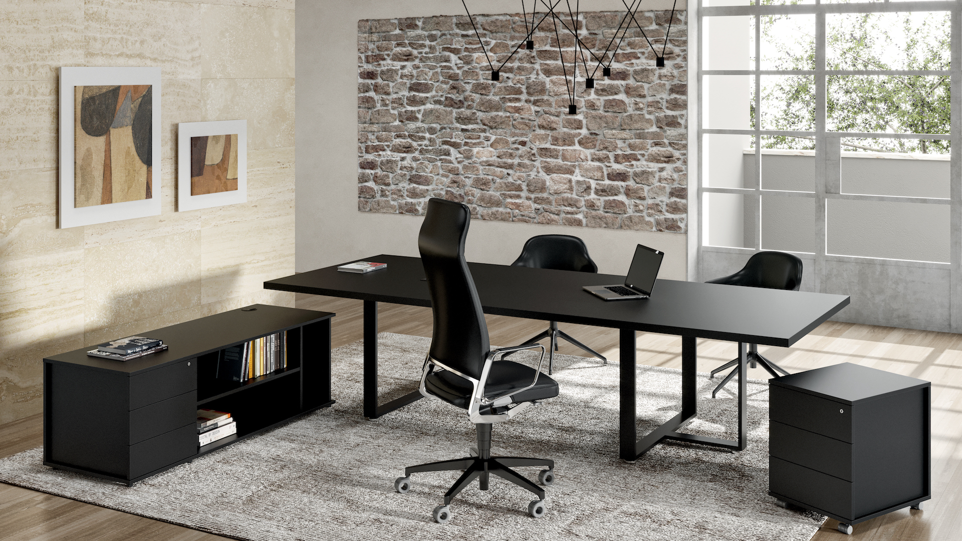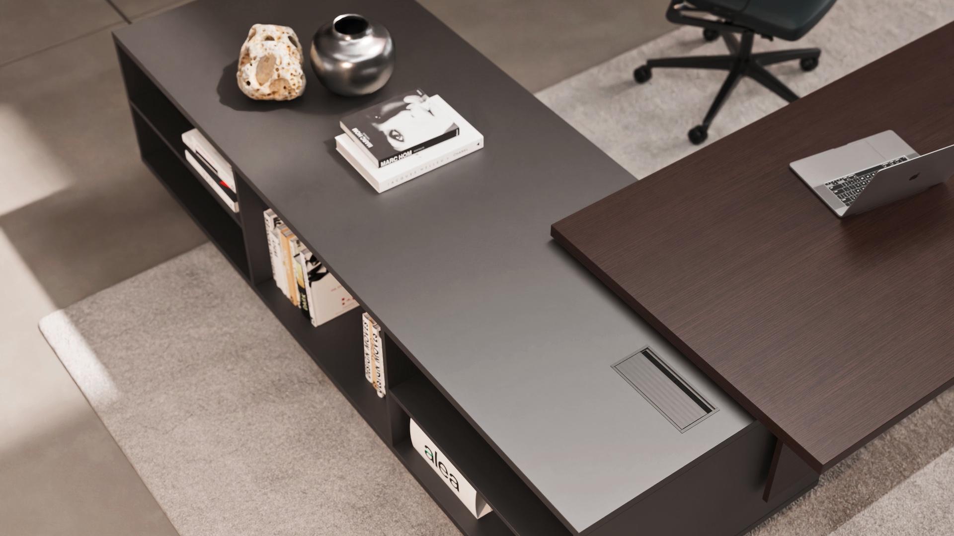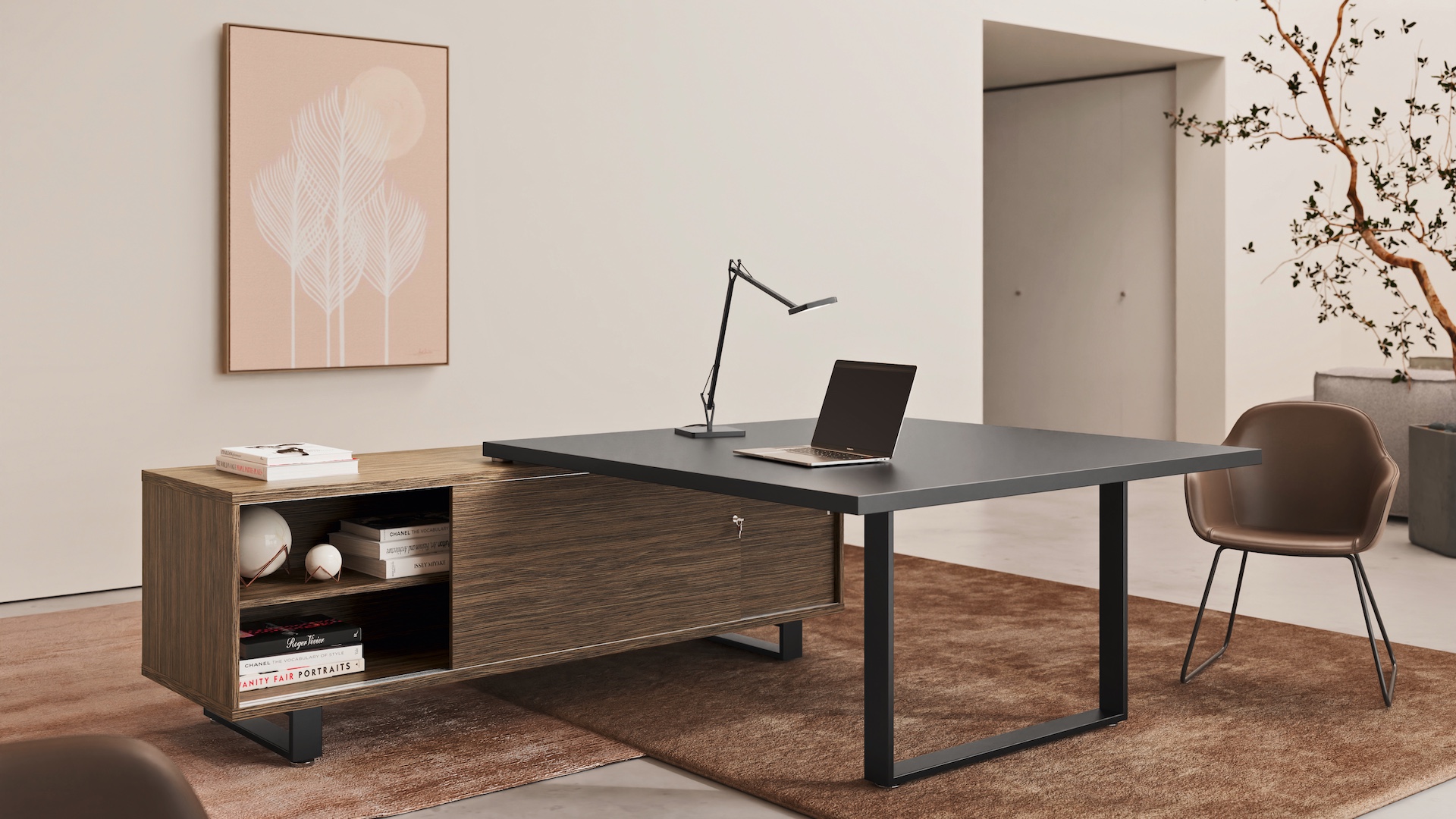 Archimede also offers a side unit with sliding doors, with feet matching the desk, a small pedestal can be built into the unit.