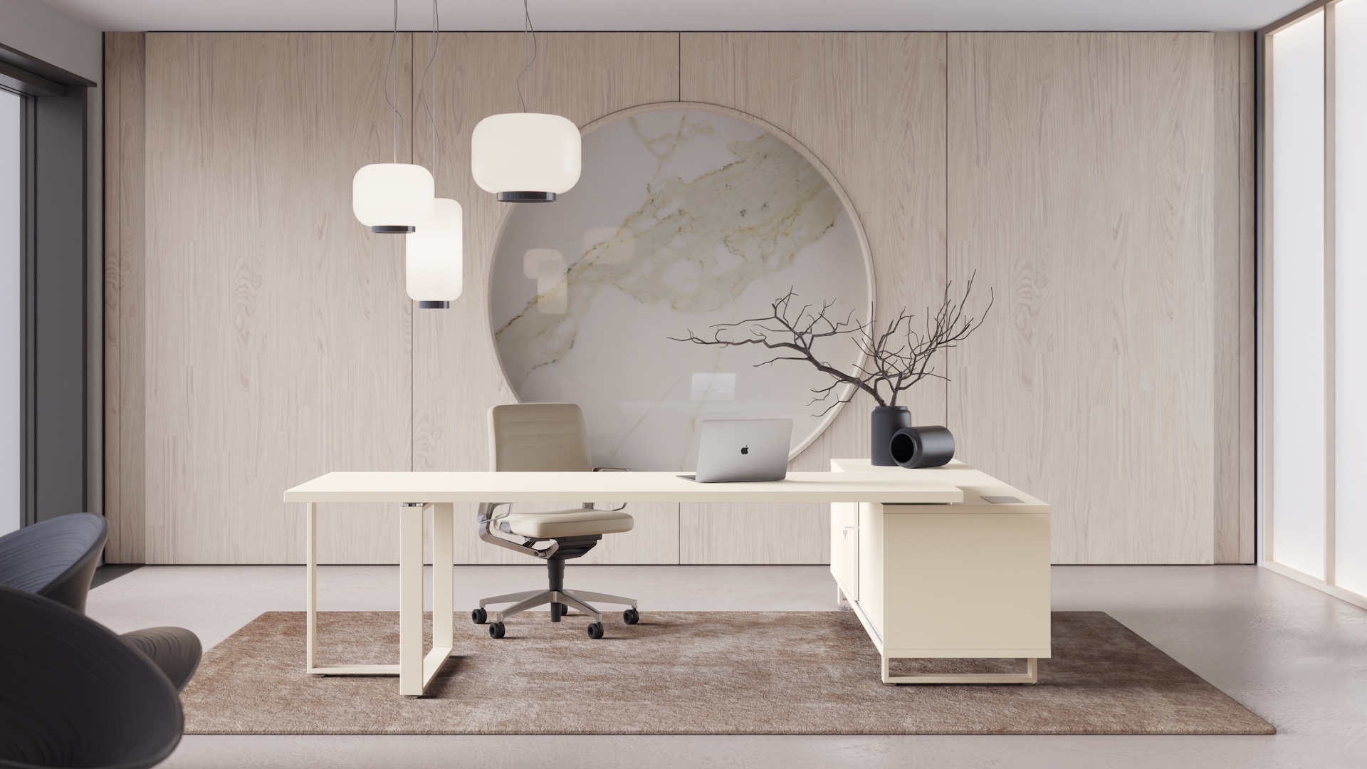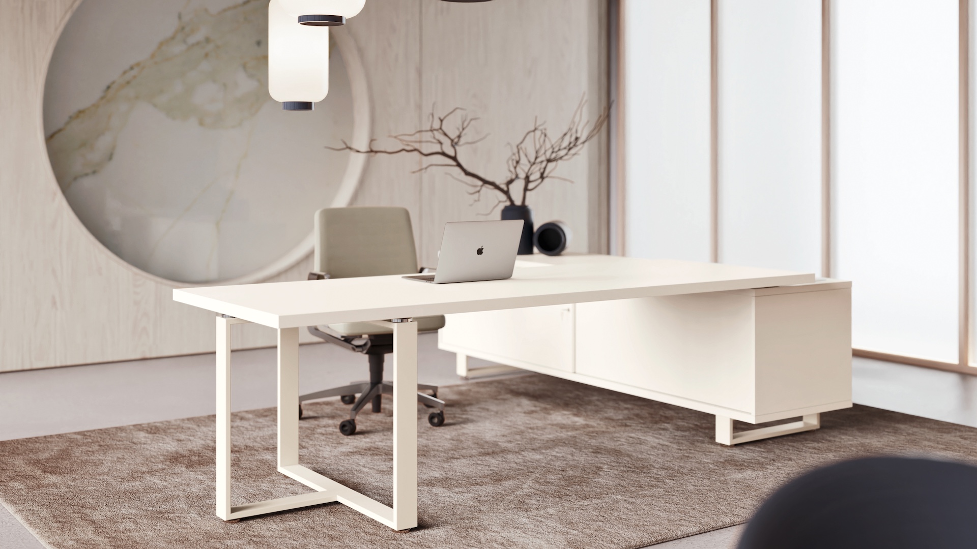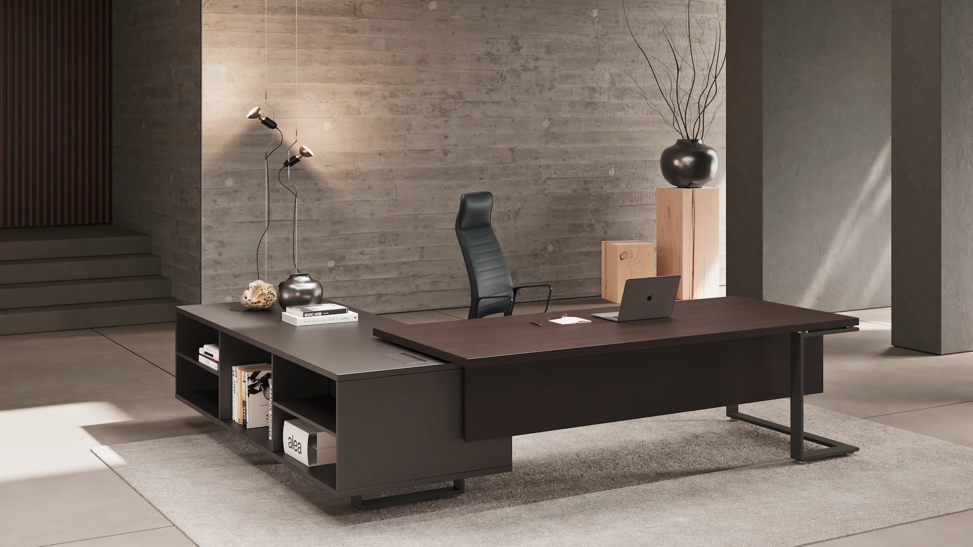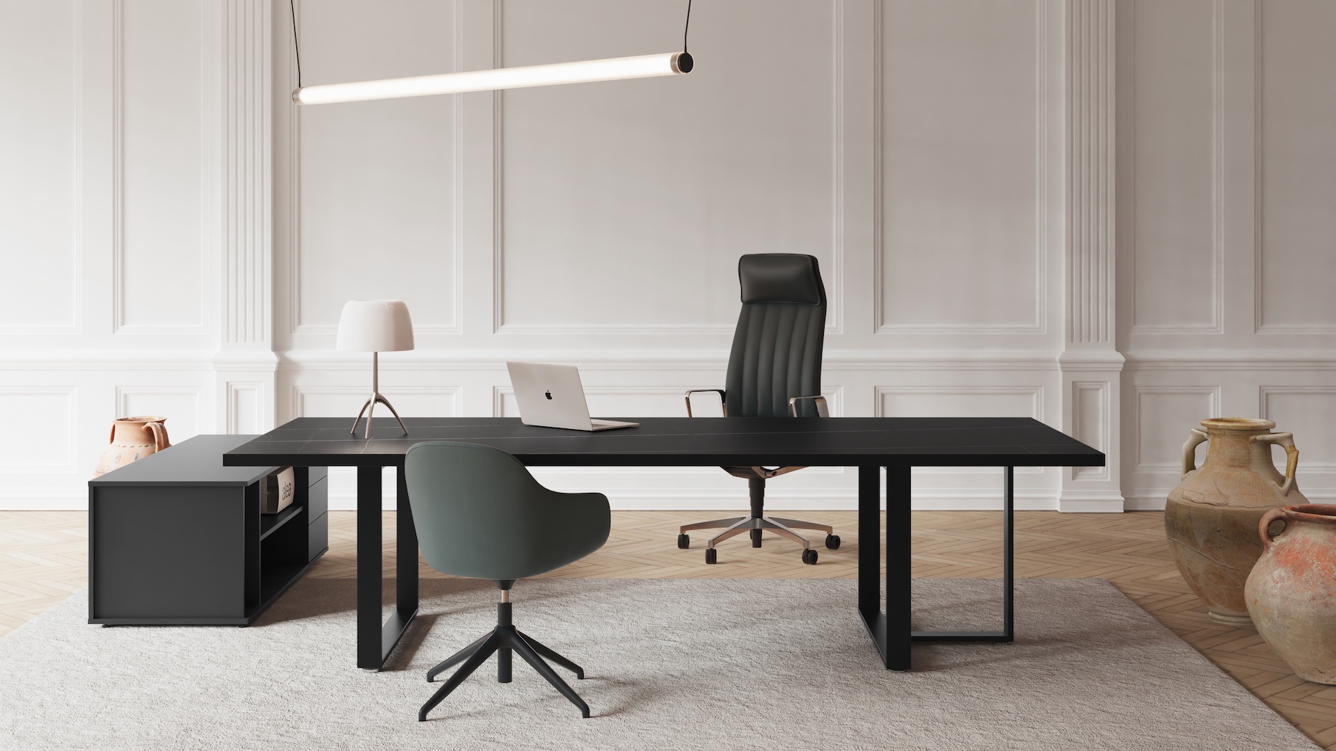 Archimede also offers a side unit with sliding doors, with feet matching the desk, a small pedestal can be built into the unit.