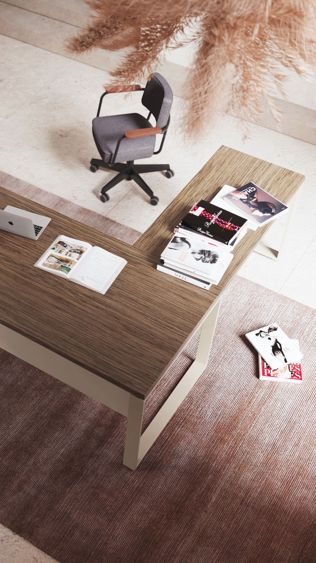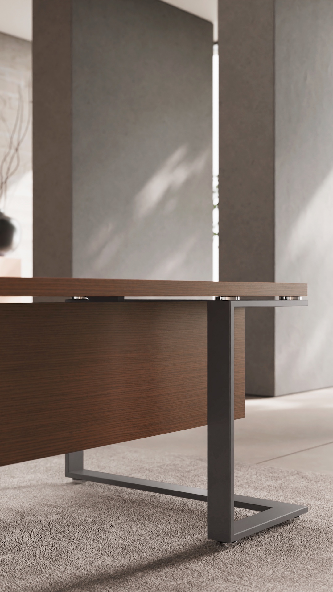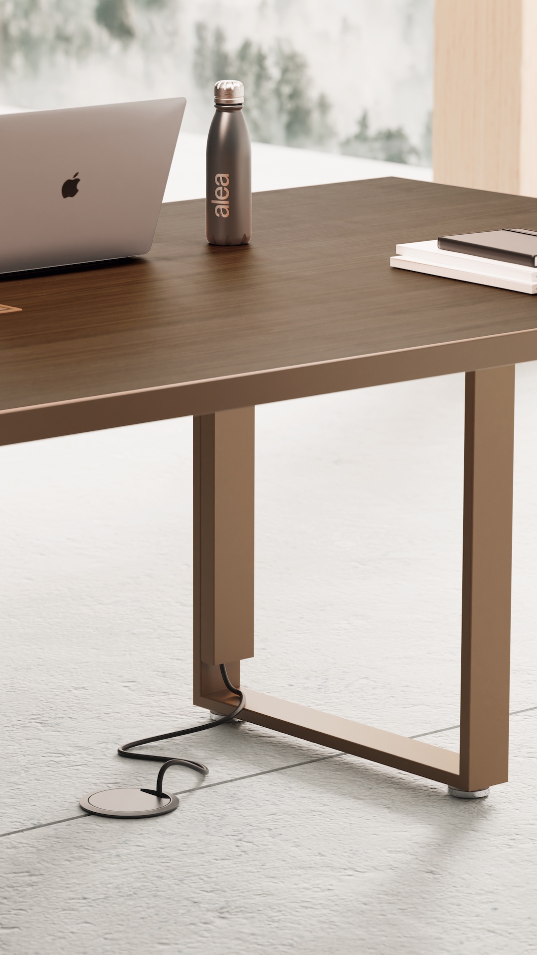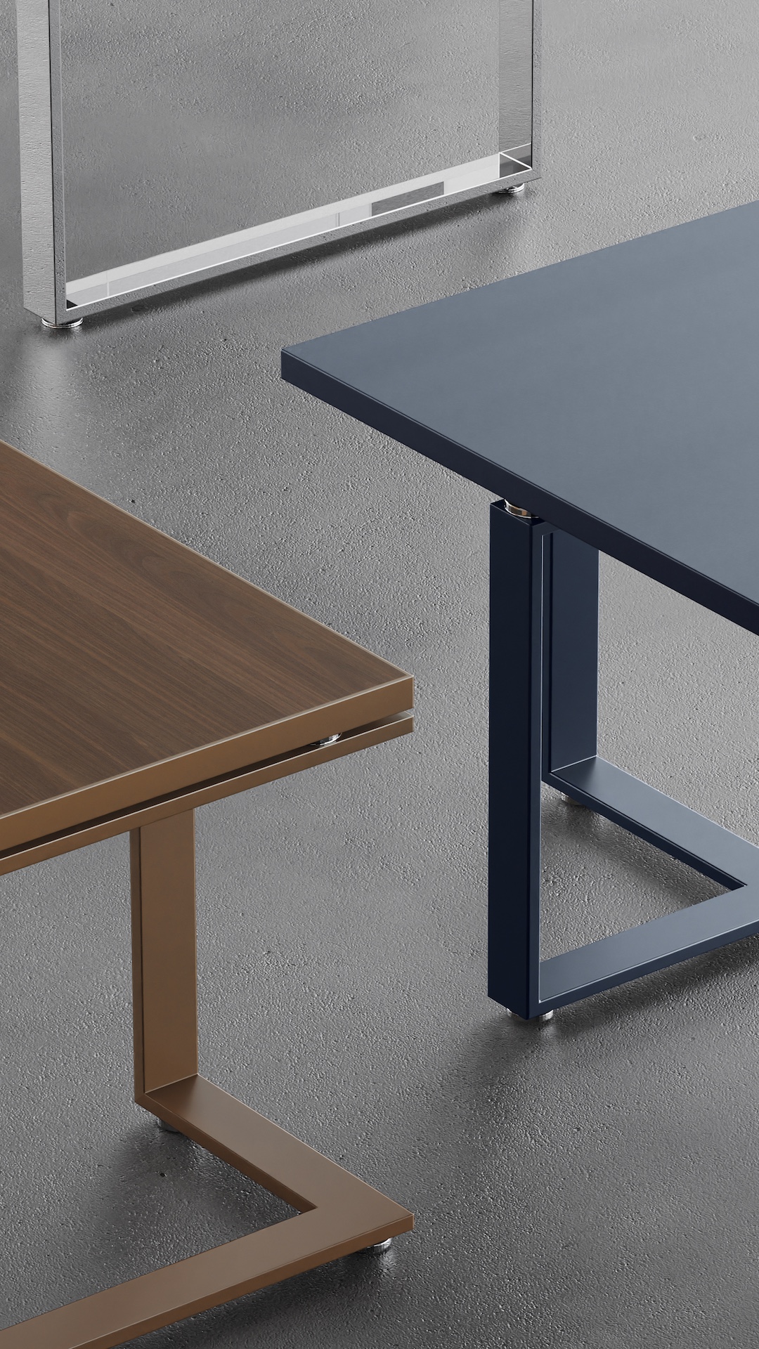The supporting structure consists of metal legs with an epoxy finish or polished brushed. Legs come in three design options: ring shape, T-shaped and L-shaped. Tops are available in wood veneer or Italian melamine, in backlacquered glass (also in the antifinger version), leather and porcelaine tile, framed by an aluminium profile.