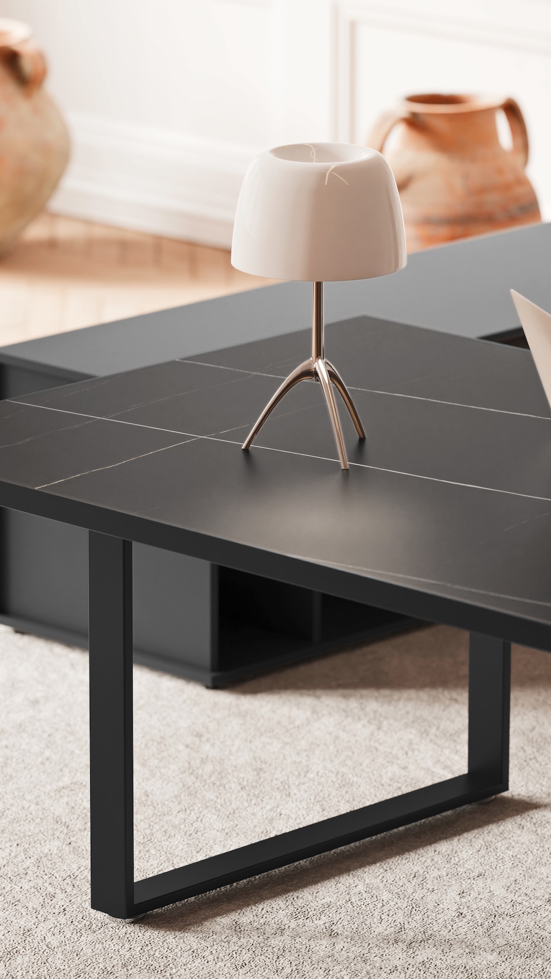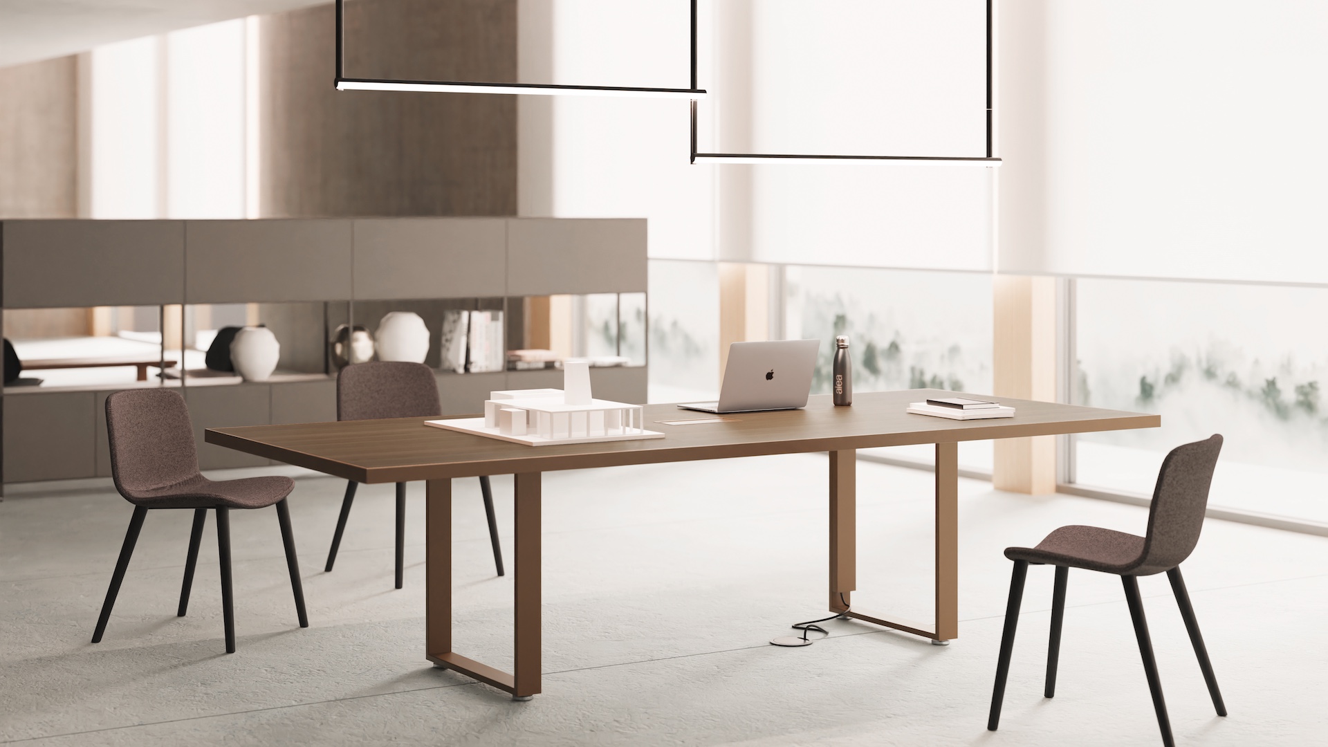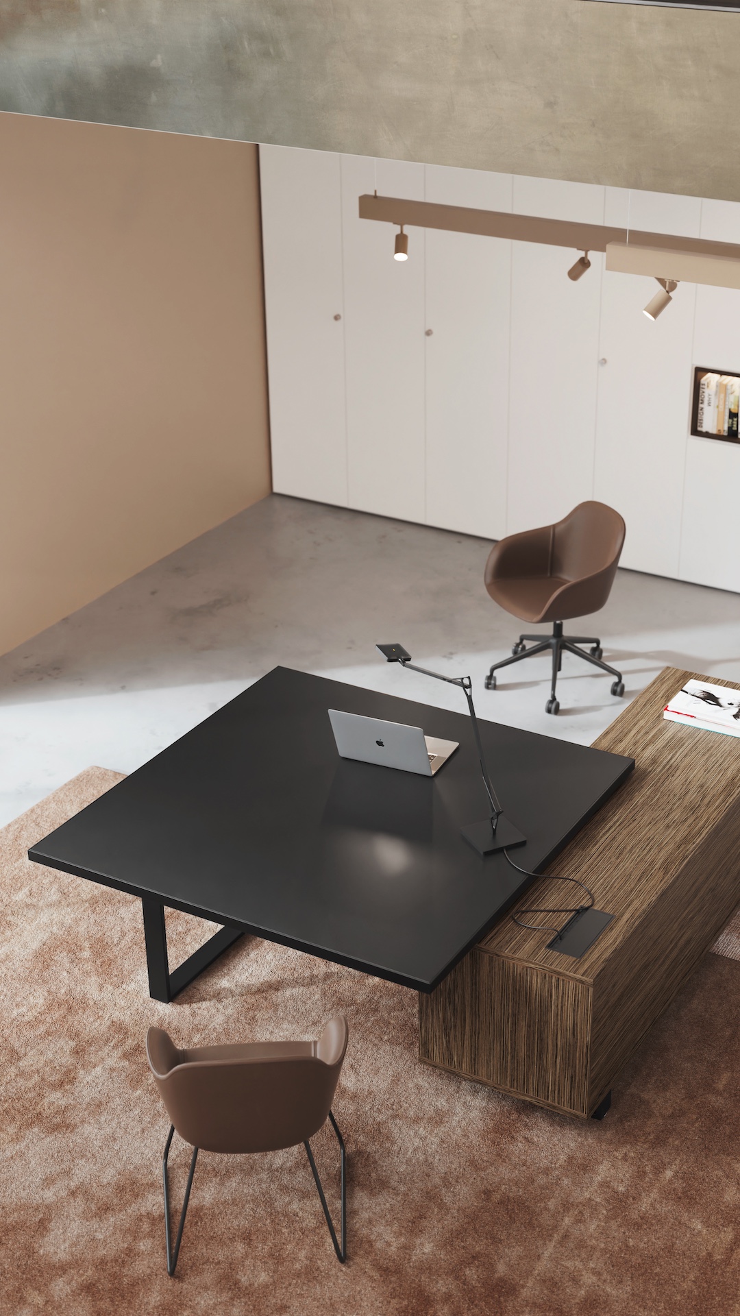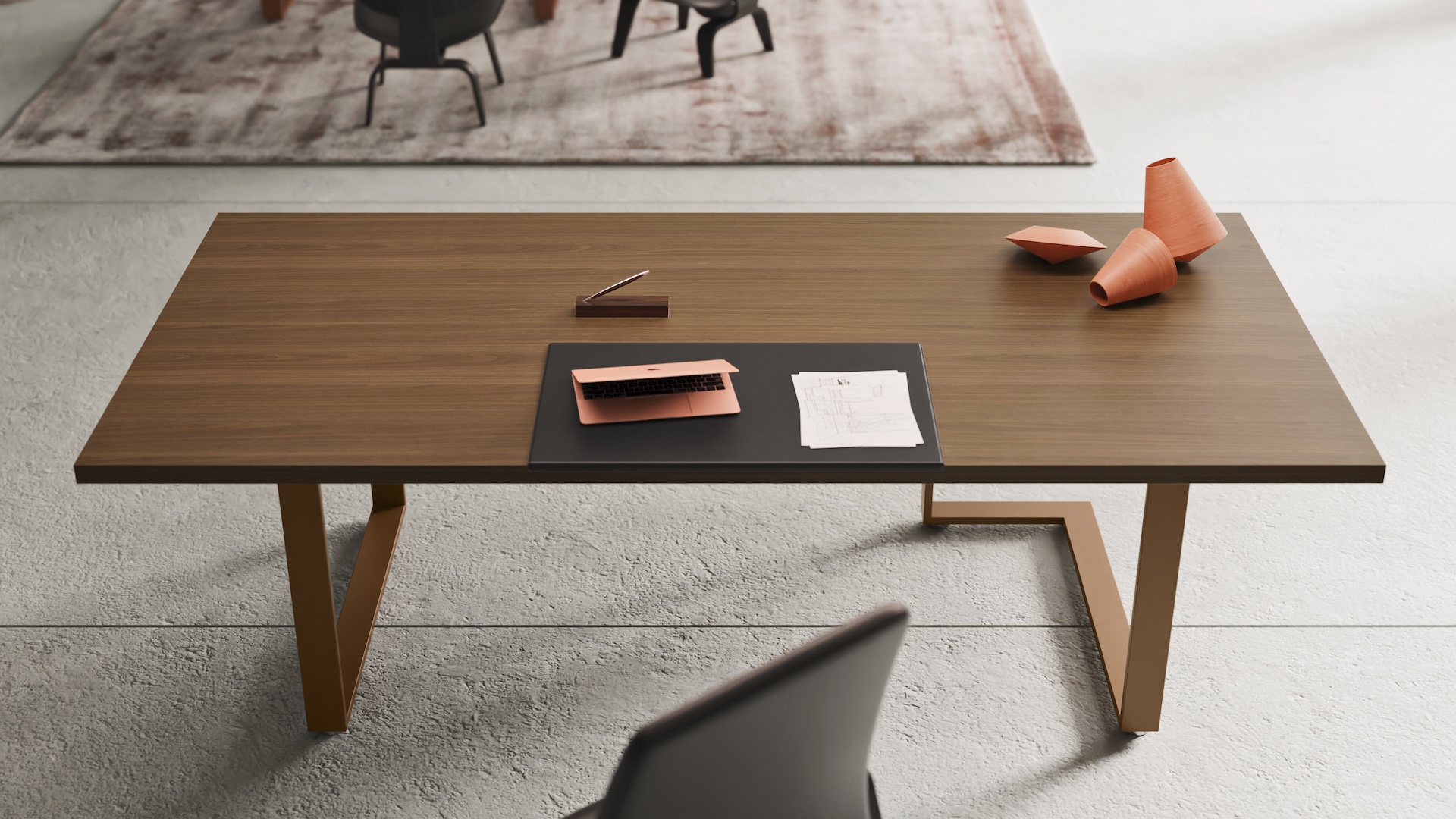 The supporting structure consists of metal legs with an epoxy finish or polished brushed. Legs come in three design options: ring shape, T-shaped and L-shaped. Tops are available in wood veneer or Italian melamine, in backlacquered glass (also in the antifinger version), leather and porcelaine tile, framed by an aluminium profile.