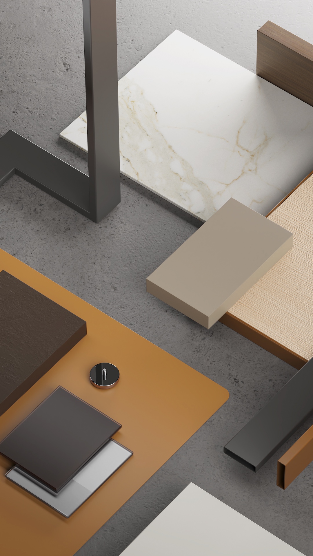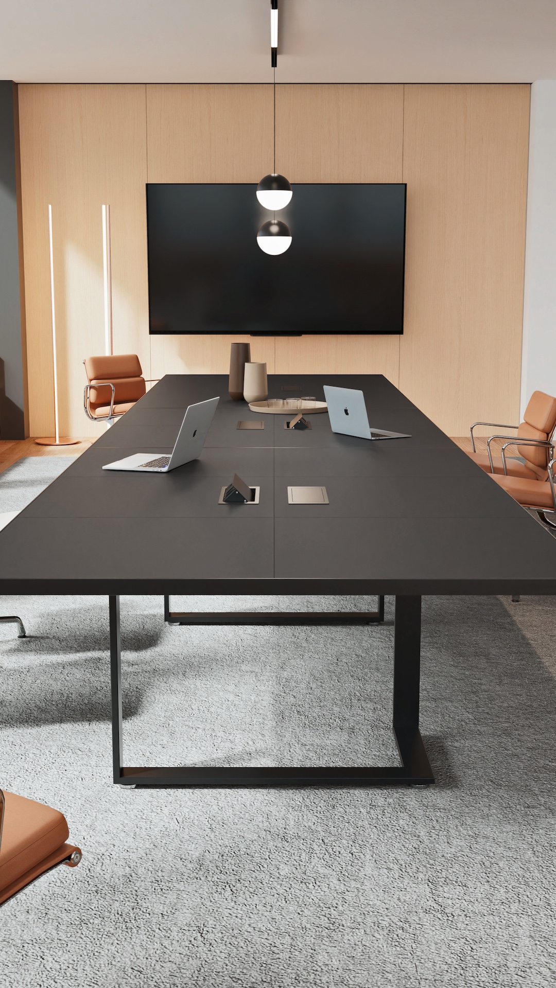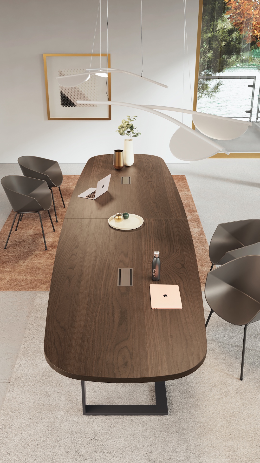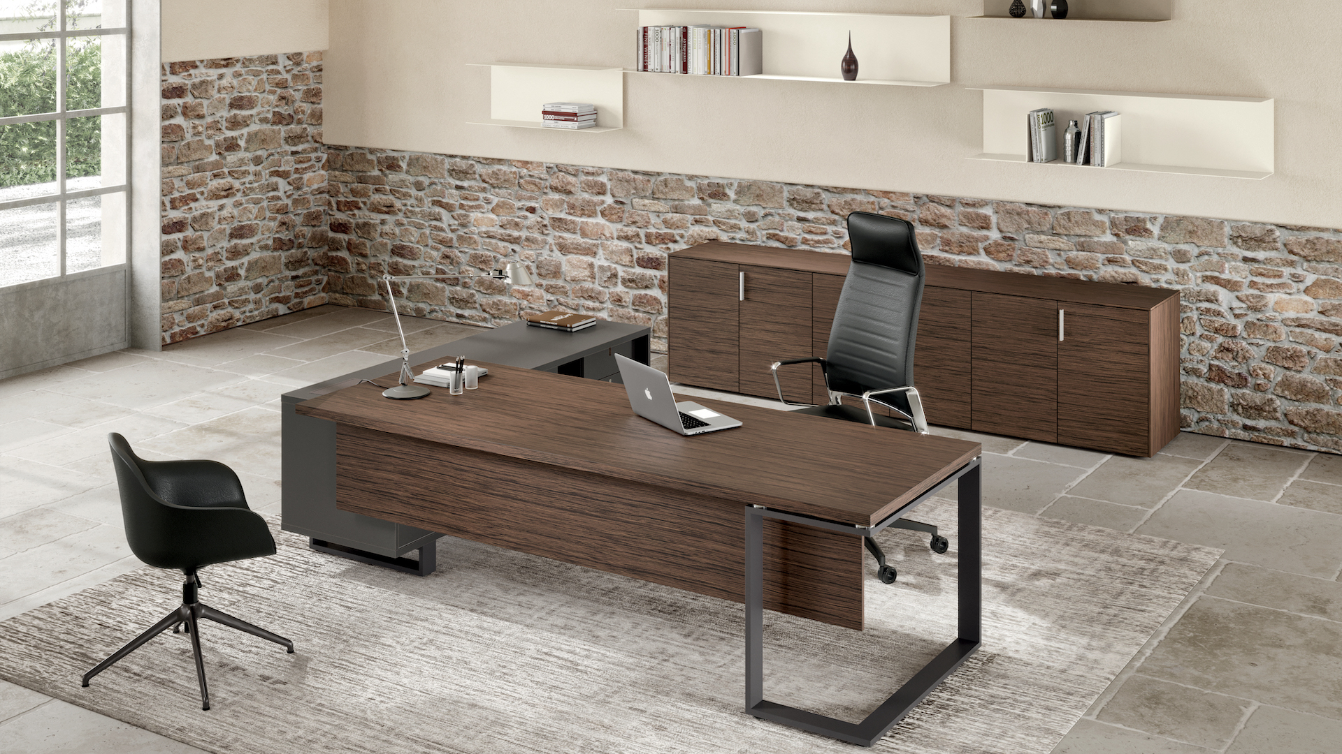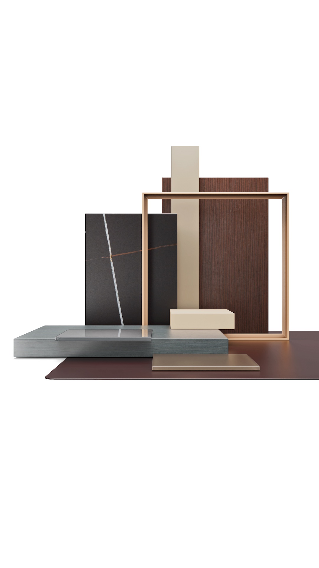The supporting structure consists of metal legs with an epoxy finish or polished brushed. Legs come in three design options: ring shape, T-shaped and L-shaped. Tops are available in wood veneer or Italian melamine, in backlacquered glass (also in the antifinger version), leather and porcelaine tile, framed by an aluminium profile.