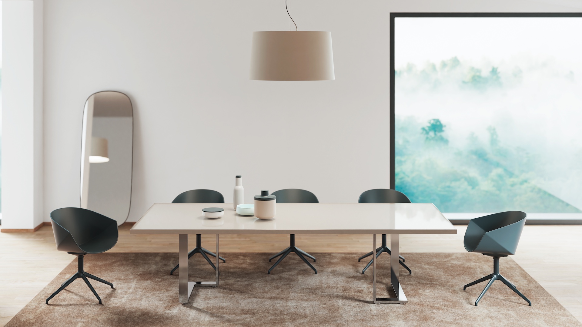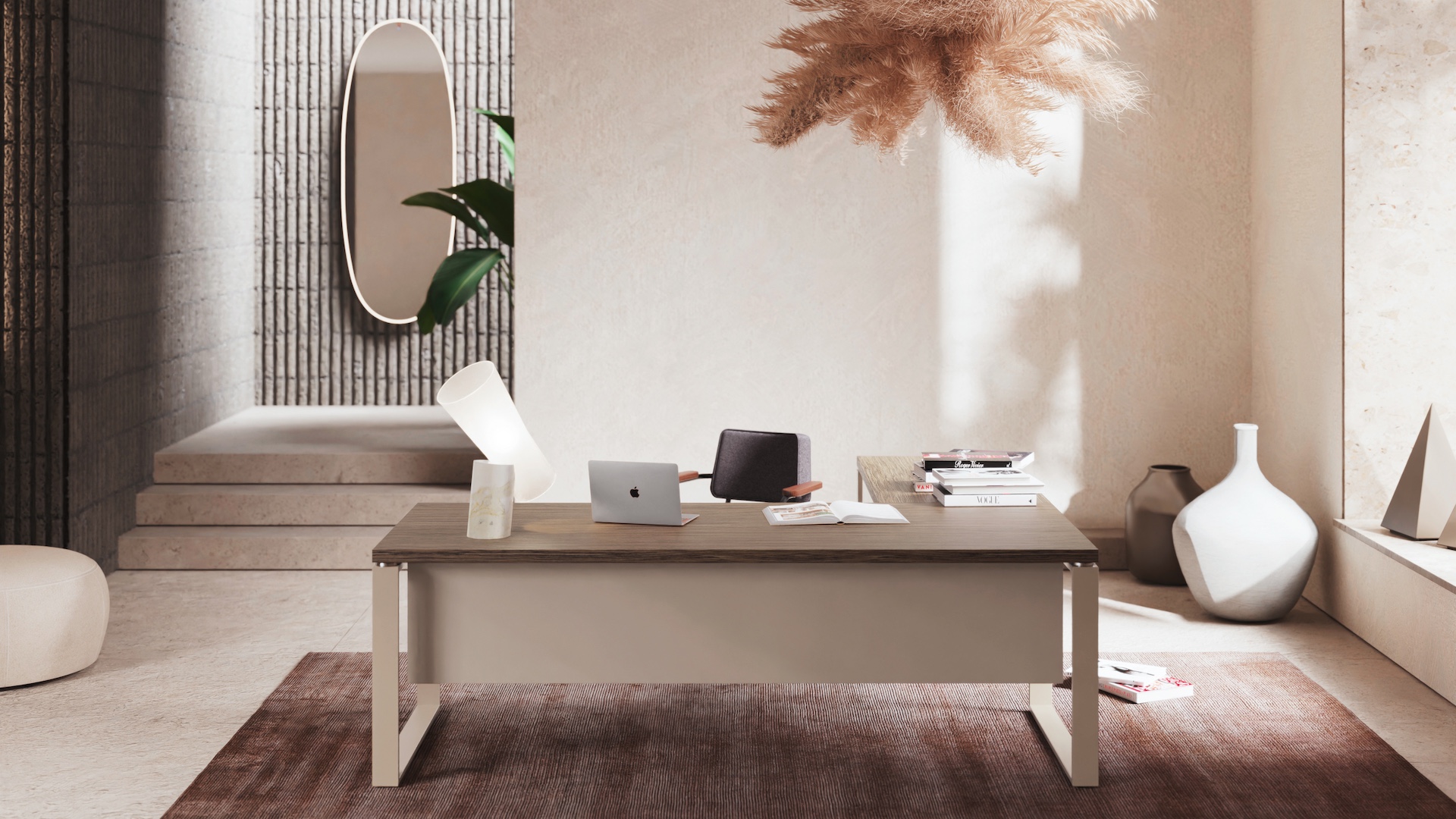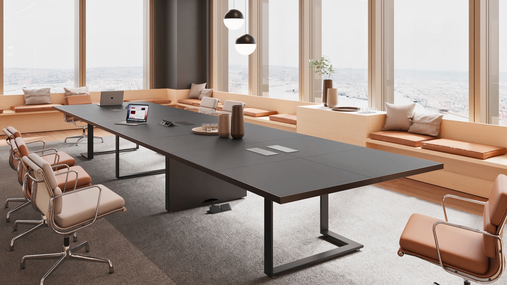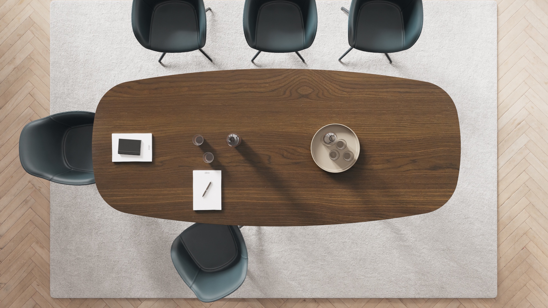The supporting structure consists of metal legs with an epoxy finish or polished brushed. Legs come in three design options: ring shape, T-shaped and L-shaped. Tops are available in wood veneer or Italian melamine, in backlacquered glass (also in the antifinger version), leather and porcelaine tile, framed by an aluminium profile.
