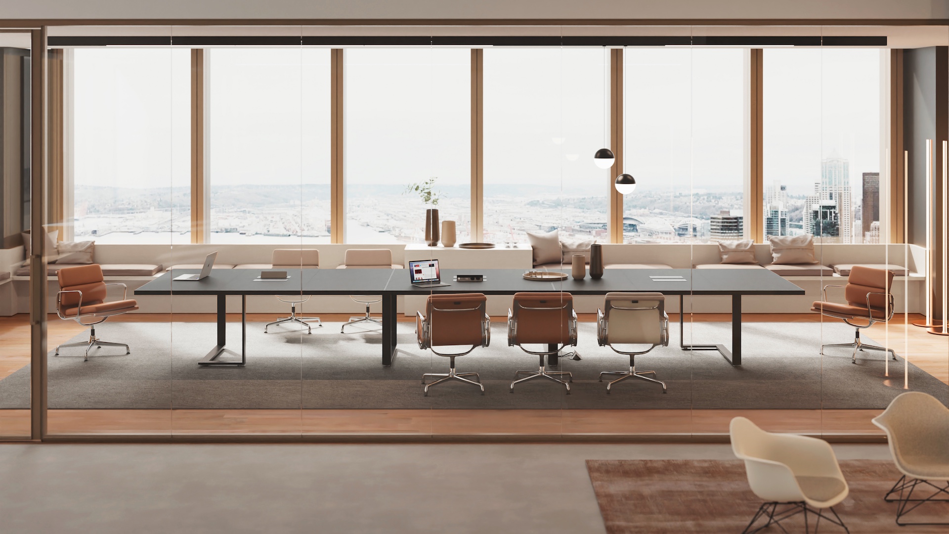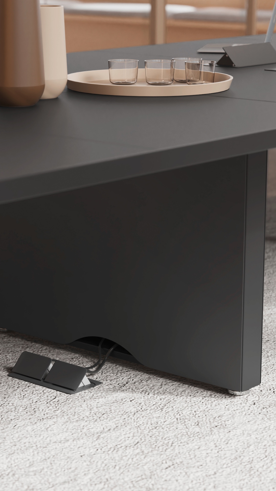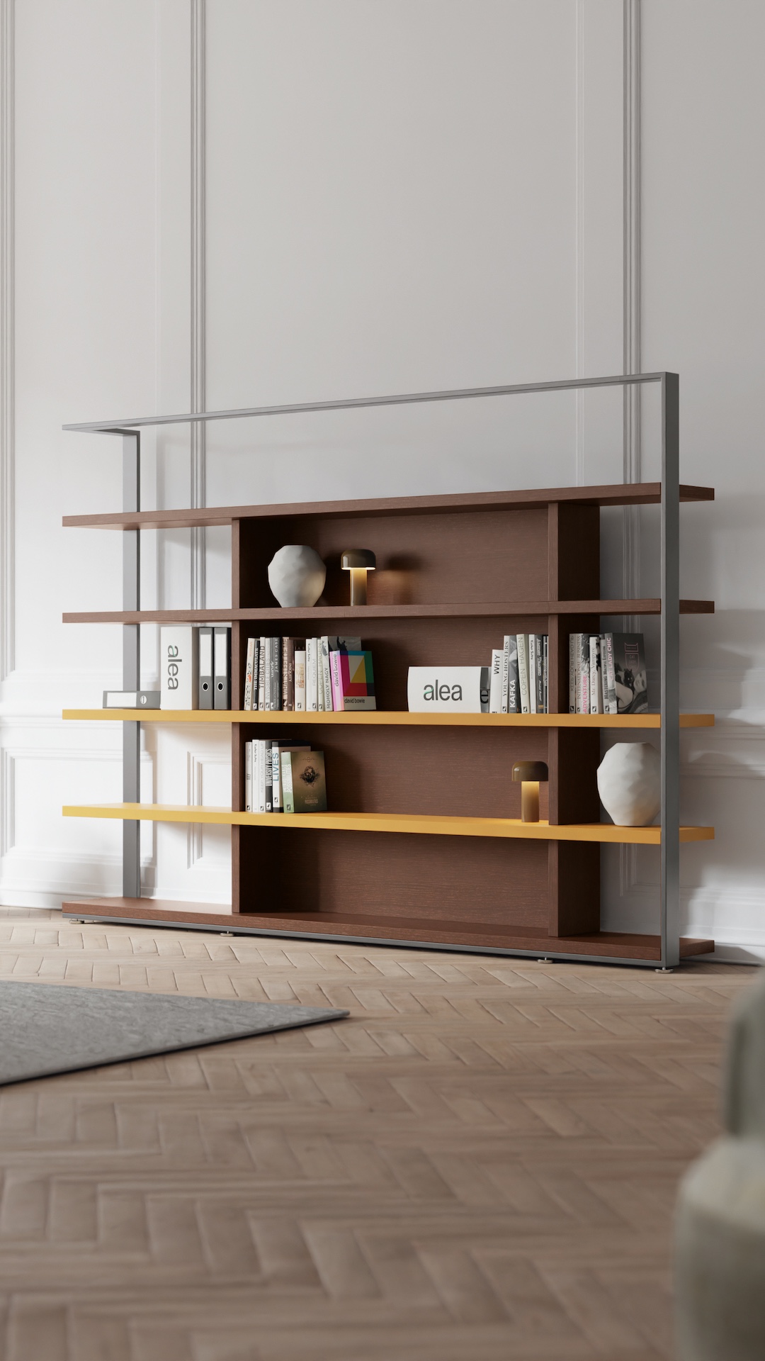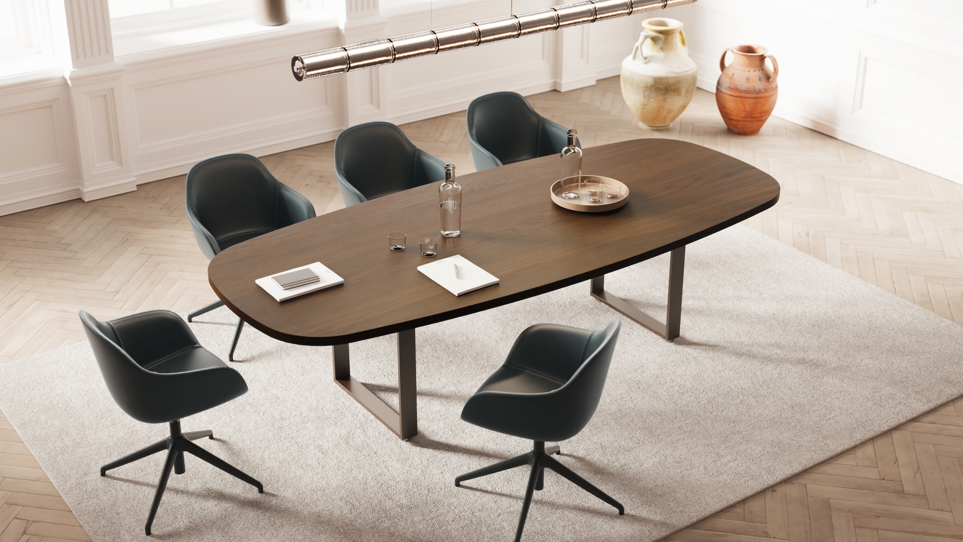 The supporting structure consists of metal legs with an epoxy finish or polished brushed. Legs come in three design options: ring shape, T-shaped and L-shaped. Tops are available in wood veneer or Italian melamine, in backlacquered glass (also in the antifinger version), leather and porcelaine tile, framed by an aluminium profile.