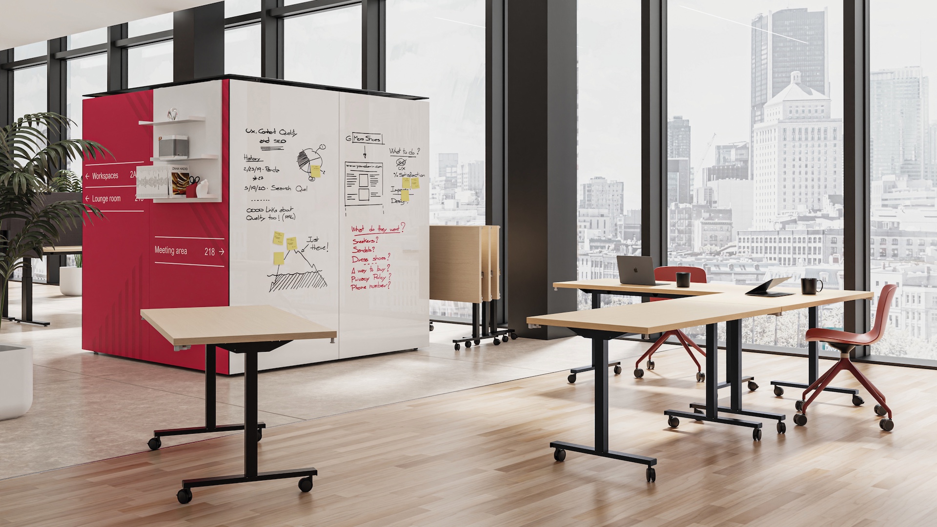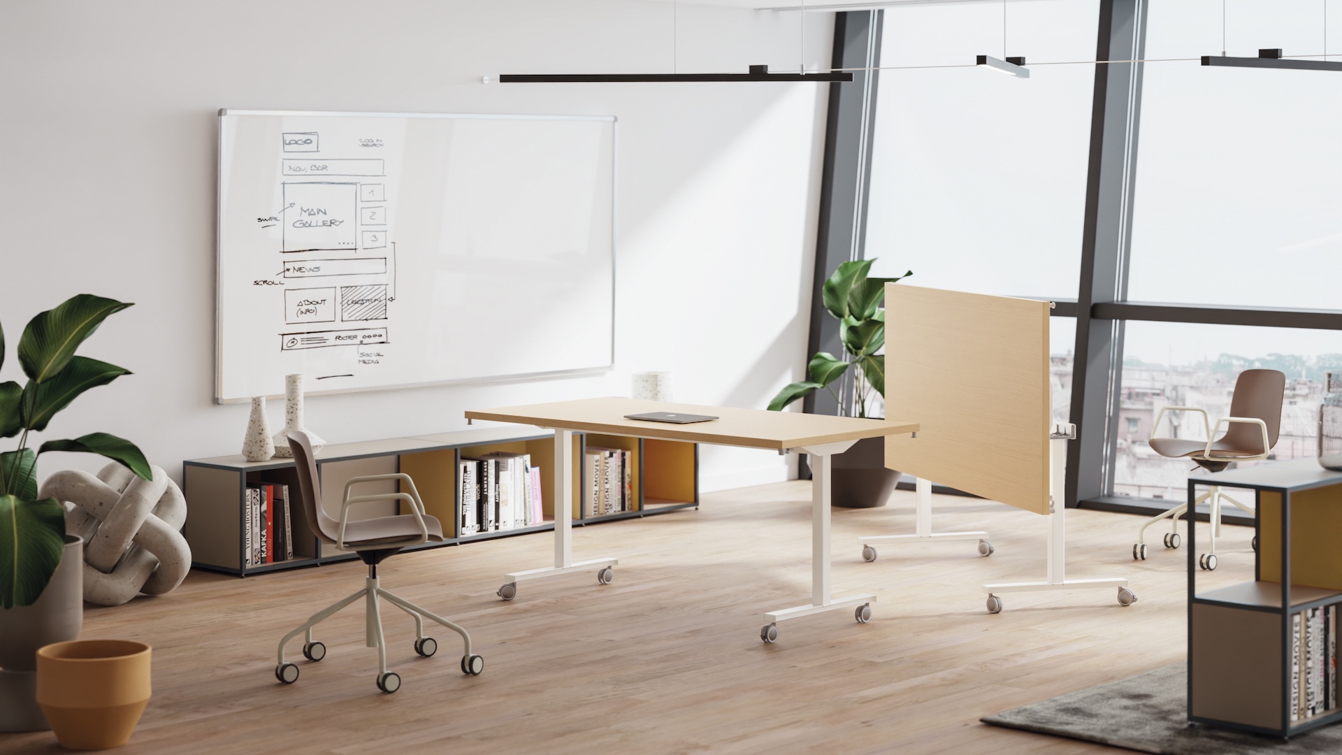 Club is a folding table on casters with many applications. It consists of an extruded aluminium structure with square section and steel feet, both painted with epoxy powder in many colours, and a top made of 30 mm thick Italian melamine panel. Tables can be easily moved, folded and stored when needed.
