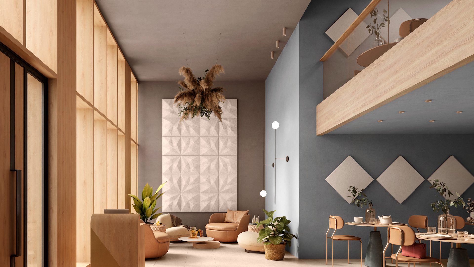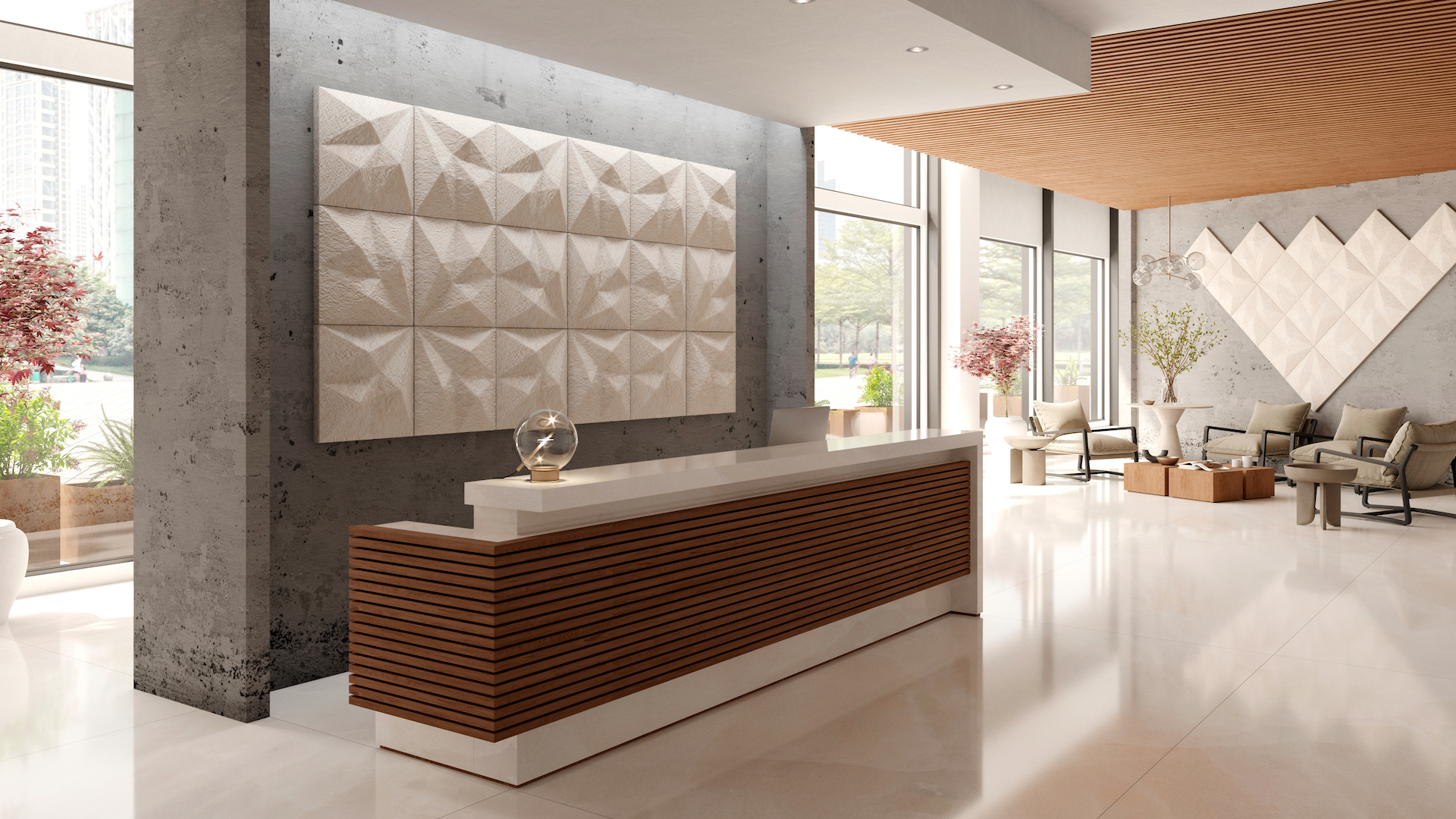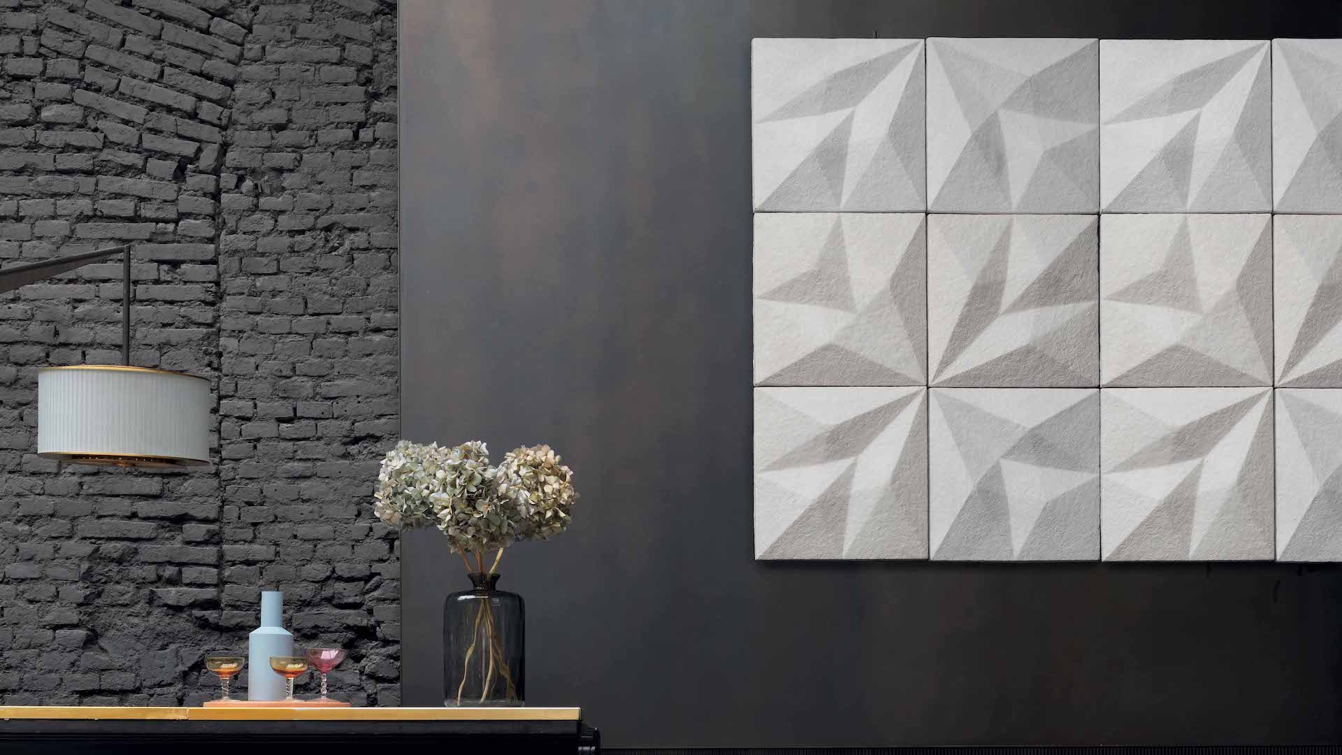 By simply rotating each module, the geometry of the panels allows for playful and surprising compositions. Their decorative potential is complemented with the natural color of Mogu materials – for a bold, radical and yet unintrusive design. A sculptural product that makes each wall a classic.