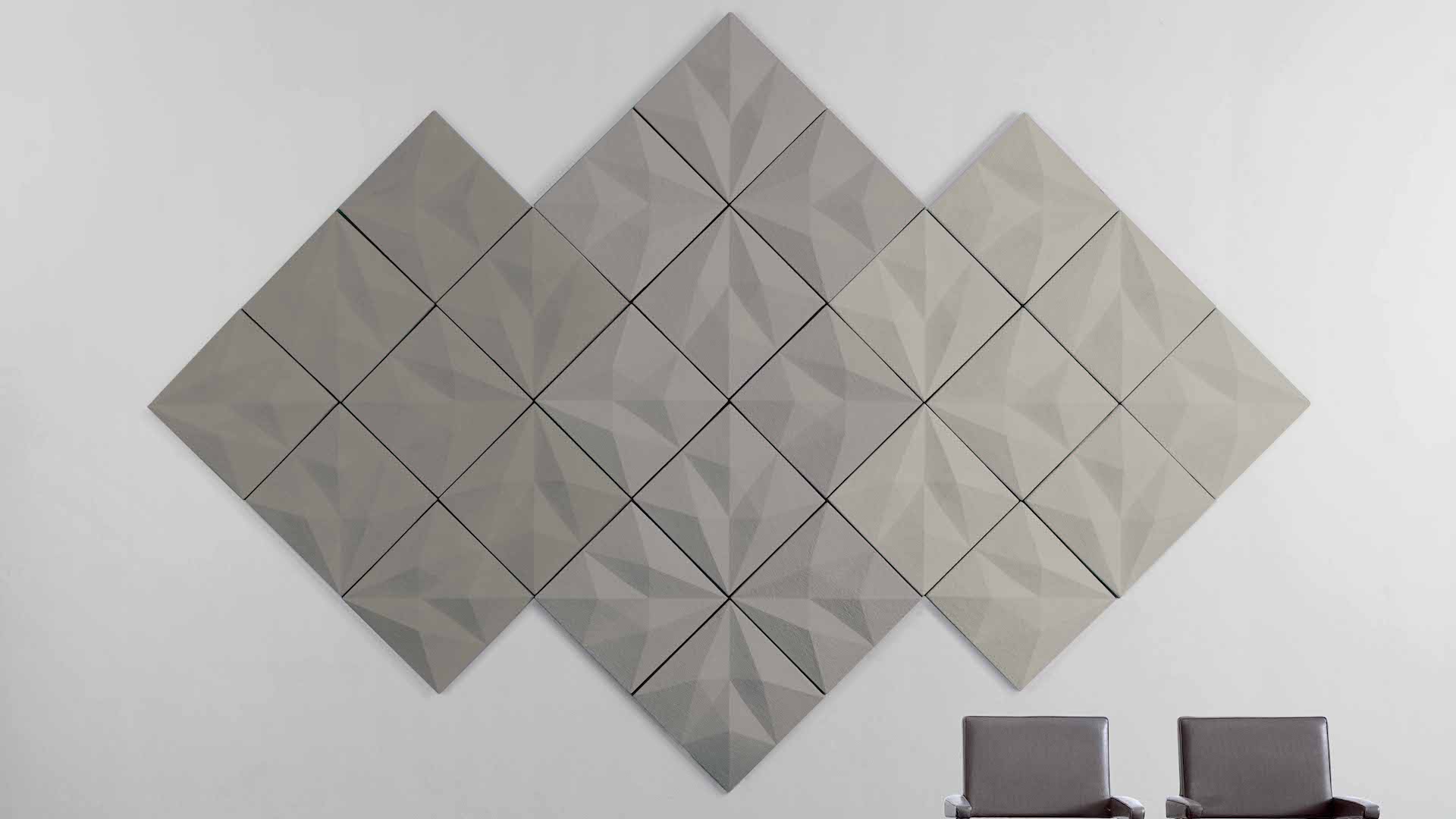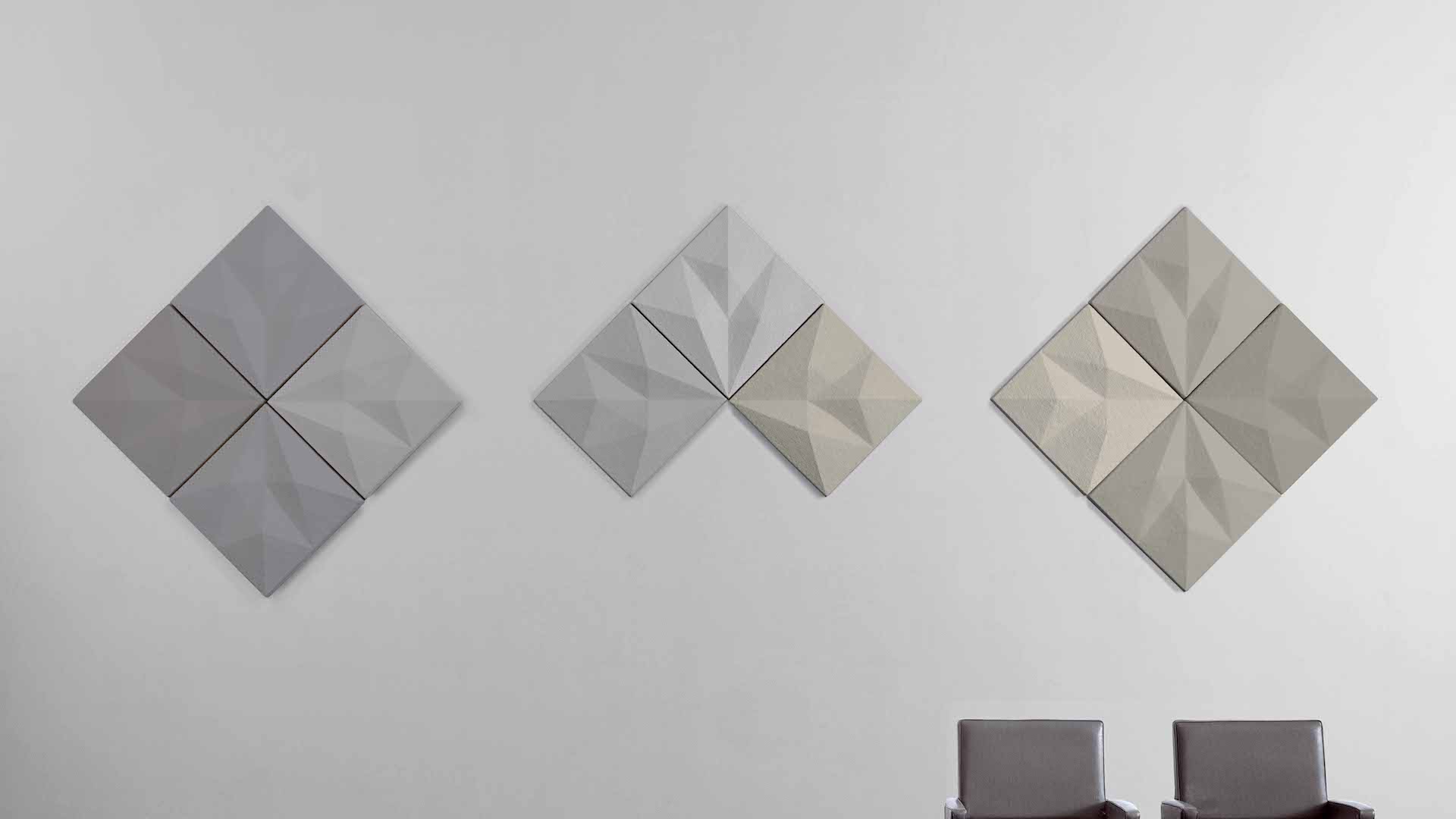 Light and sound – two invisible elements of our everyday environments. The Kite panel is inspired by the interplay between light and the candid surface of mycelium materials. The geometric folds create a visual pattern through shadows and highlights, in playful contrasts with the softness of Mogu materials.
