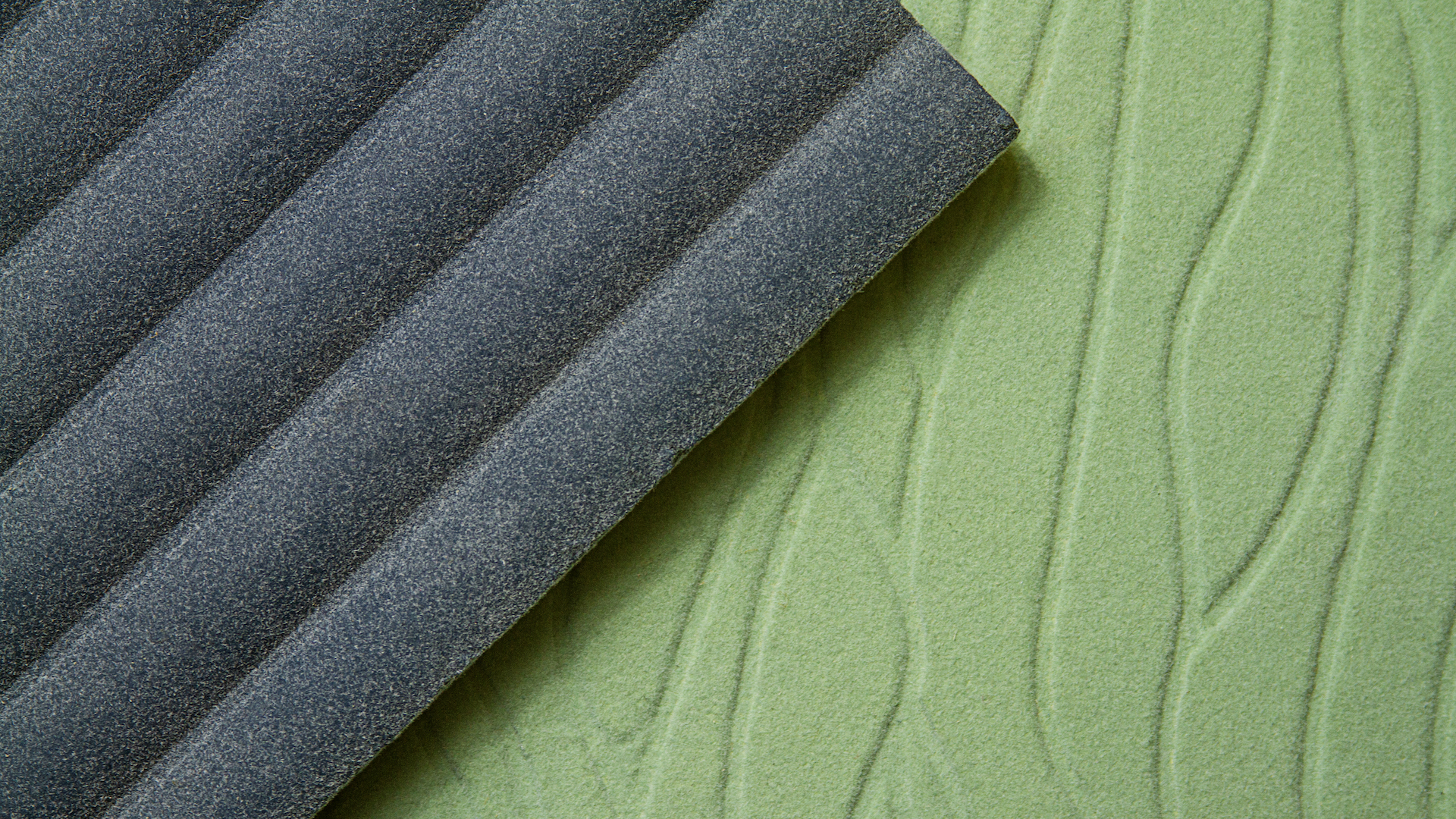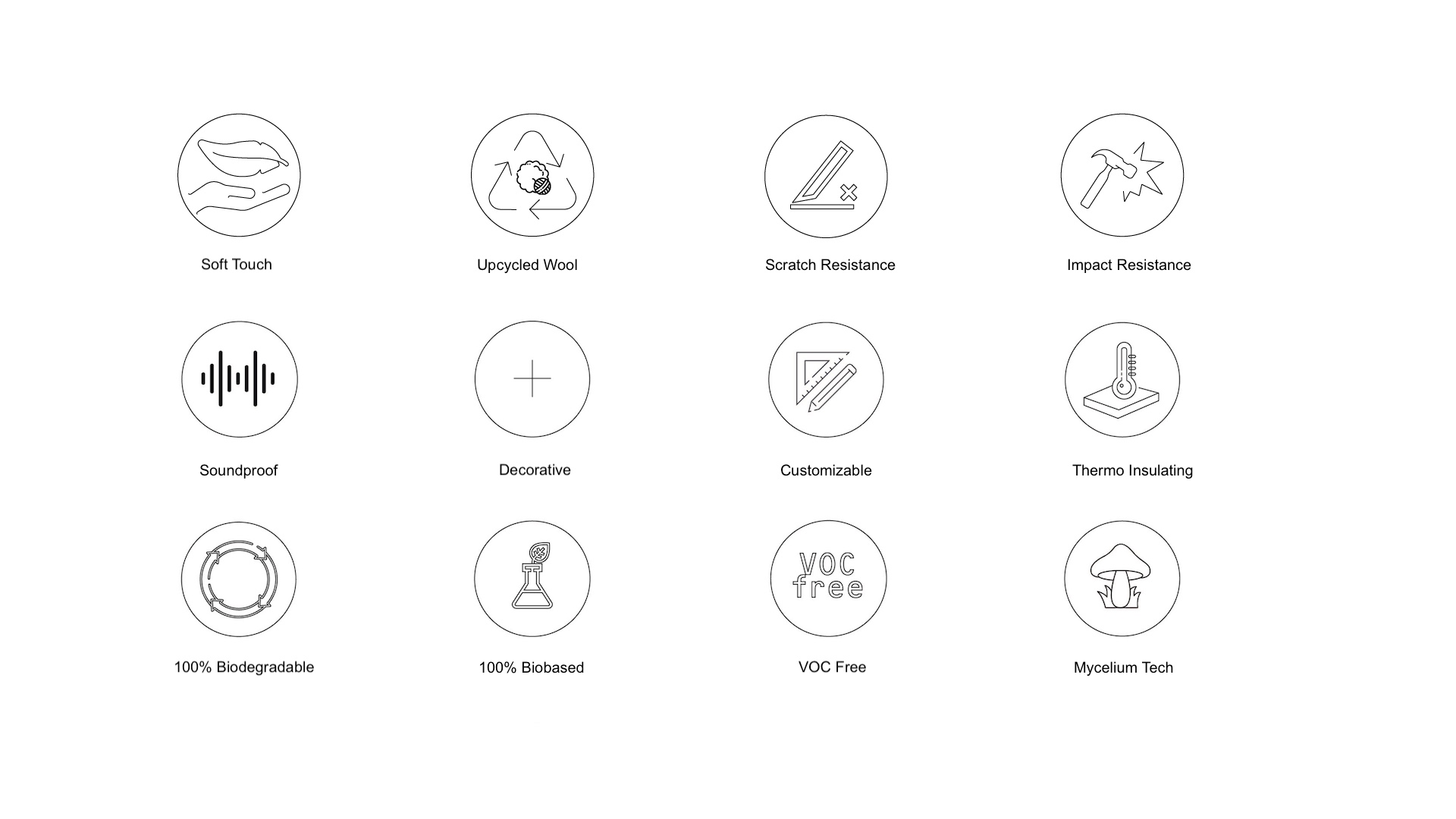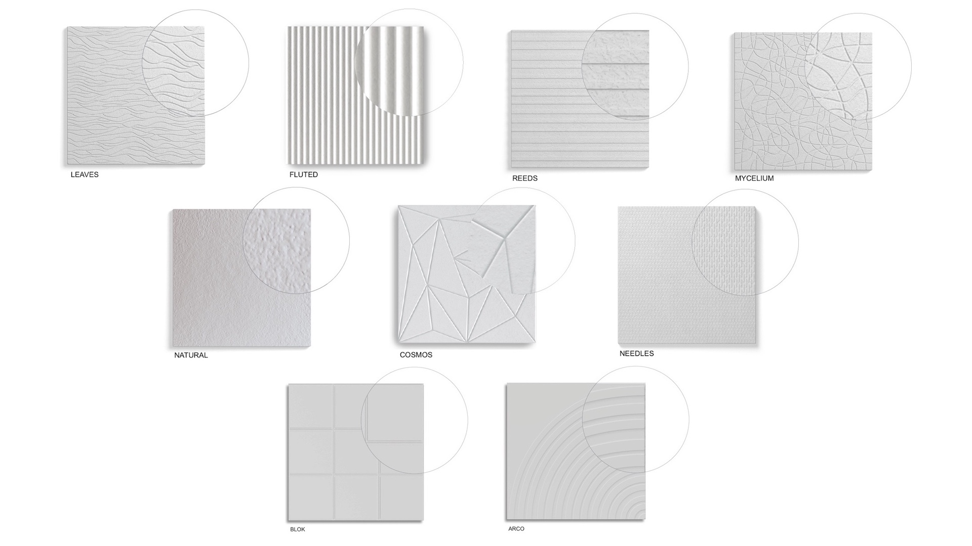 This finishing is derived from upcycled textiles, which are pulverized and applied directly on mogu panels surface, ensuring greater scratch resistance, improving acoustic performance and an designing unique texture.