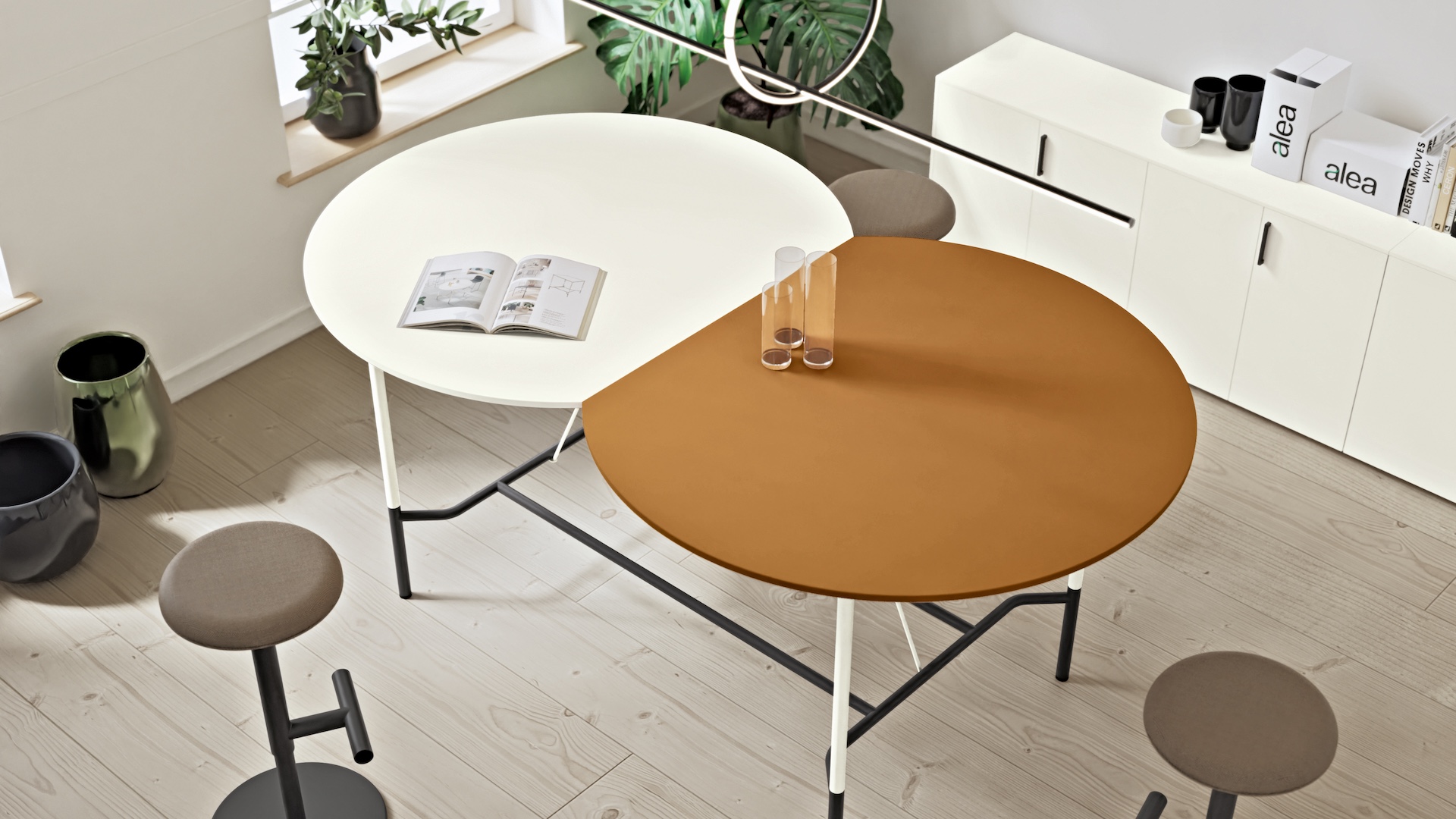 Tables are composed by 18 mm tops and tubolar legs in painted metal. They start at a height of 73,4 cm, which can be increased to 90 or 105 cm thanks to an additional base frame with footrest, which can be painted in a different colour and can be added or removed as required.