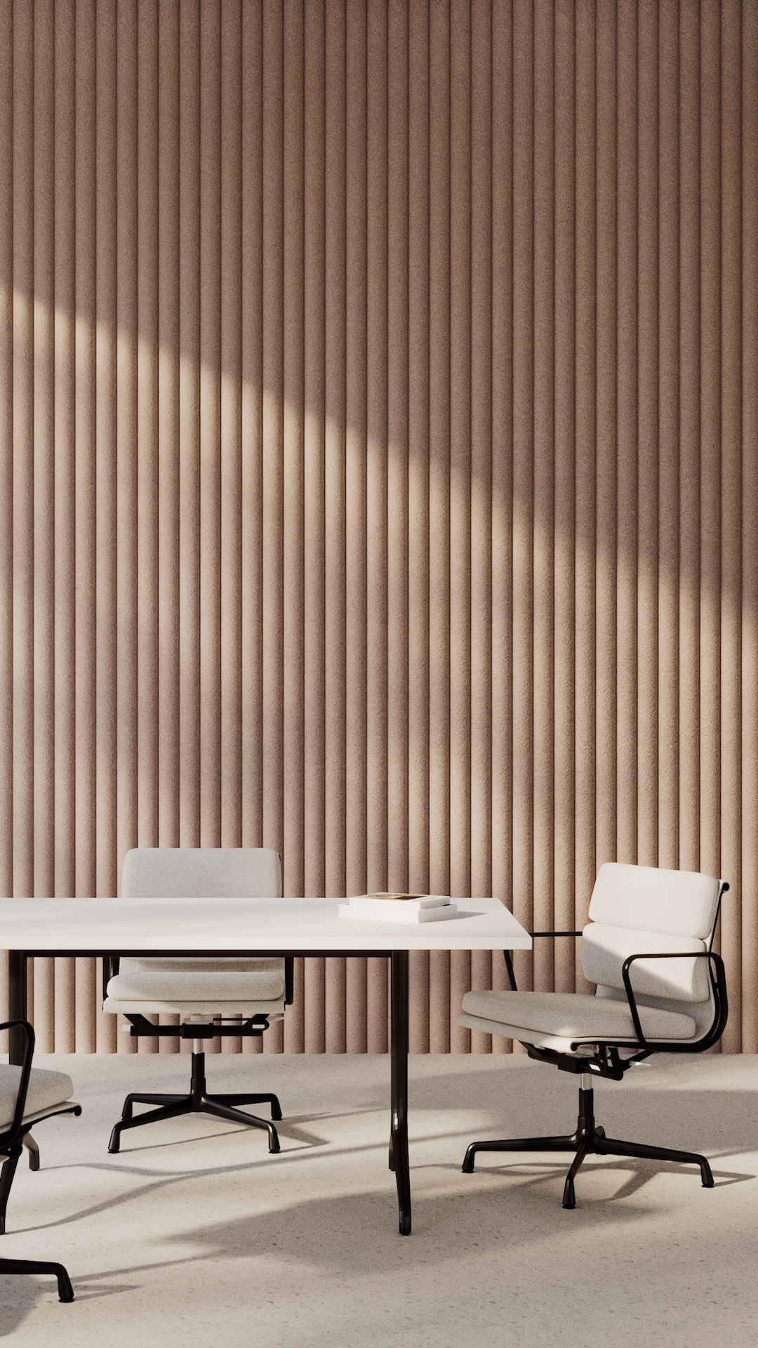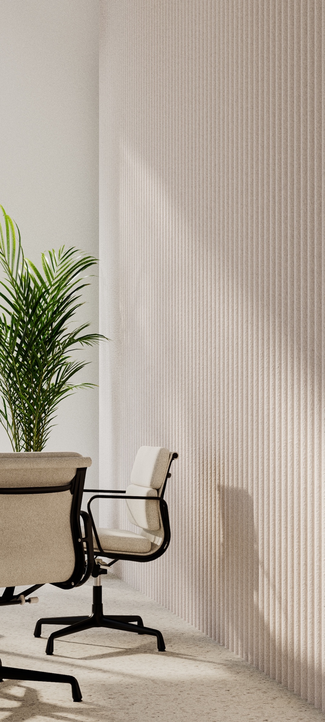 Beneath its refined form lies high-performance acoustic engineering from our Impact LAB: concealed air chambers within the 12mm ARCHISONIC® Felt folds deliver outstanding sound absorption. Palladio is a volumetric system. The unique folding technique creates a three-dimensional profile with a depth of 55mm, adding significant visual weight and rhythm to vertical surfaces without the need for heavy construction materials. The clever geometry of Palladio does more than look good. By trapping air within its folds, the system enhances sound absorption, achieving an NRC of 0.75. It effectively mitigates reverberation in lobbies, meeting rooms, and corridors.