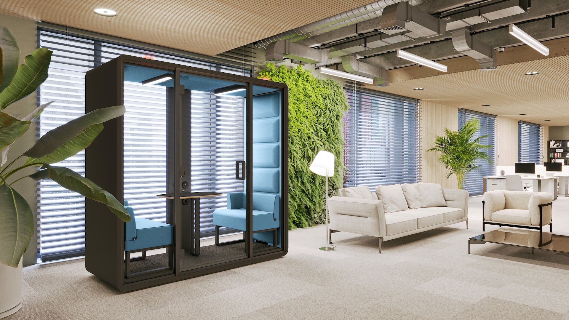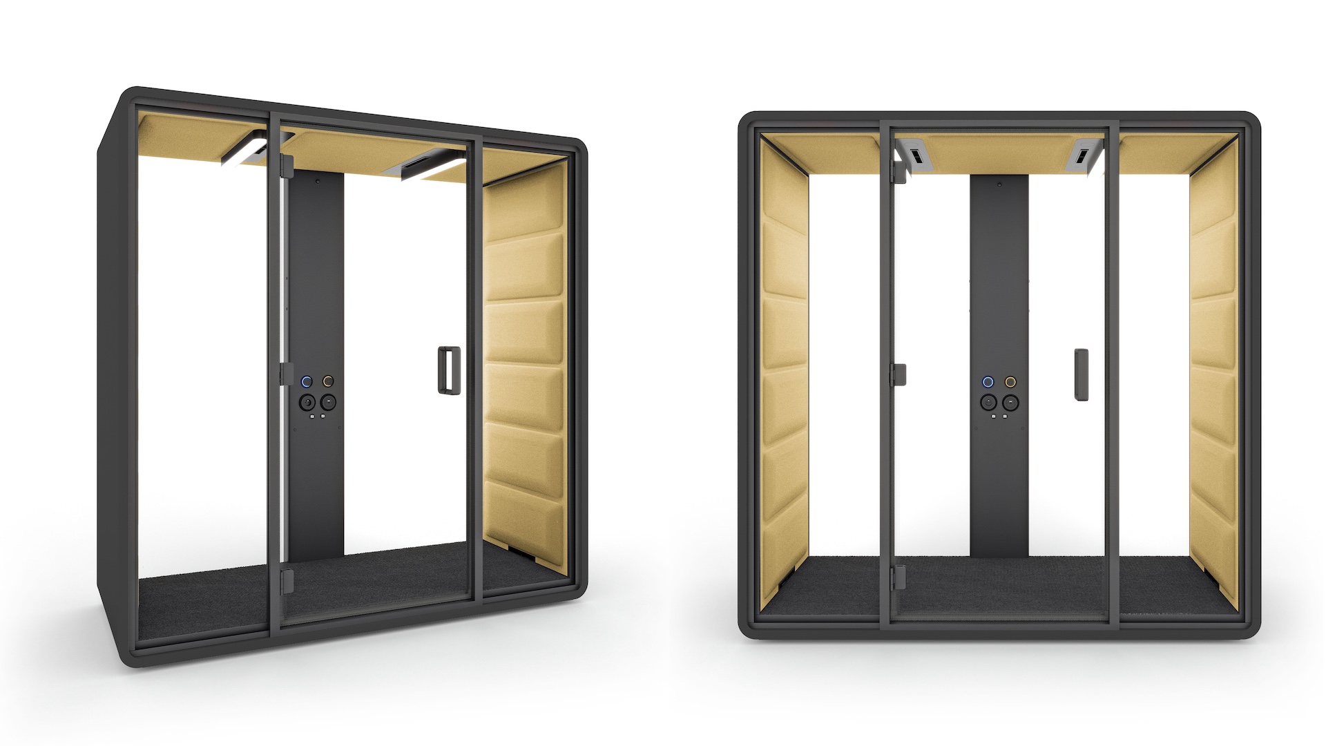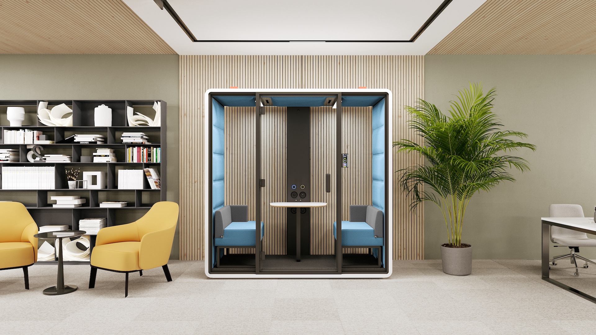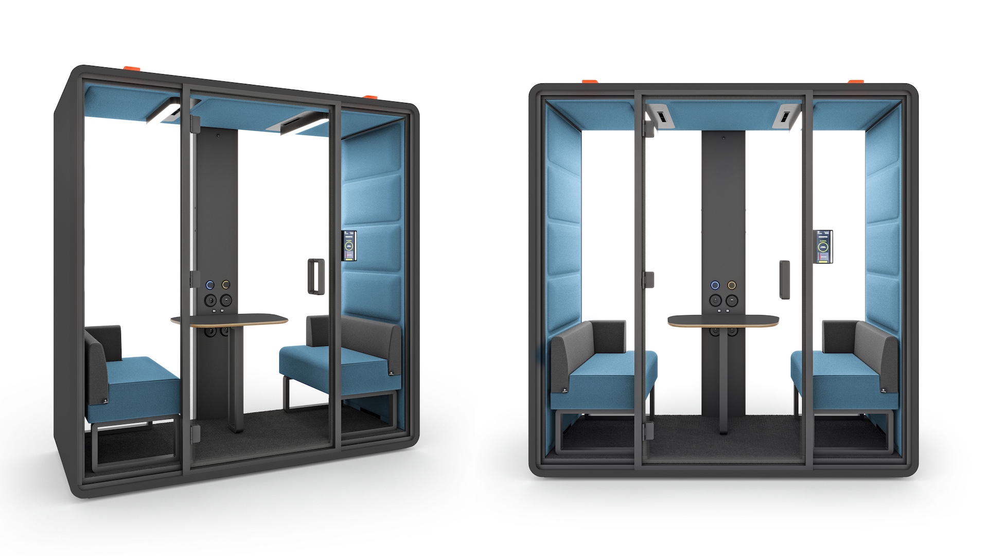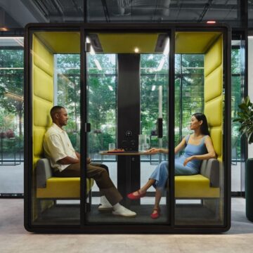 Akustična govorilnica HushFree.XM je zasnovana za sestanke dveh oseb in se zaradi svoje kompaktne velikosti dobro prilega tudi manjšim pisarniškim prostorom. HushFree.XM ima nov sistem osvetlitve z intenzivnostjo 500 lux na ravni mize. Omogoča vam, da porabite veliko več časa za sestanke in pogovore iz oči v oči ali na spletu, hkrati pa ohranite mir in tišino. Prav tako je primerena za konceptualno delo. HushAssistant je izbirni modul z zaslonom na dotik za upravljanje modula. Omogoča preproste in intuitivne spremembe barve in intenzivnosti svetlobe (2200–6500 K), hitrosti ventilatorjev v modulu in omogoča upravljanje rezervacij akustičnega modula.